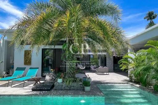 Discover this beautifully finished tropical-style villa in the heart of Chalong, a prime location that promises both a comfortable lifestyle and a strong return on investment. Just a five-minute walk from BCIS and a short drive to Robinson Chalong, this property is perfect for families and investors alike. The villa is framed by palm trees, creating a serene, green backdrop for the 10m x 4m private pool and covered terrace, which are ideal for relaxing under the Phuket sun.